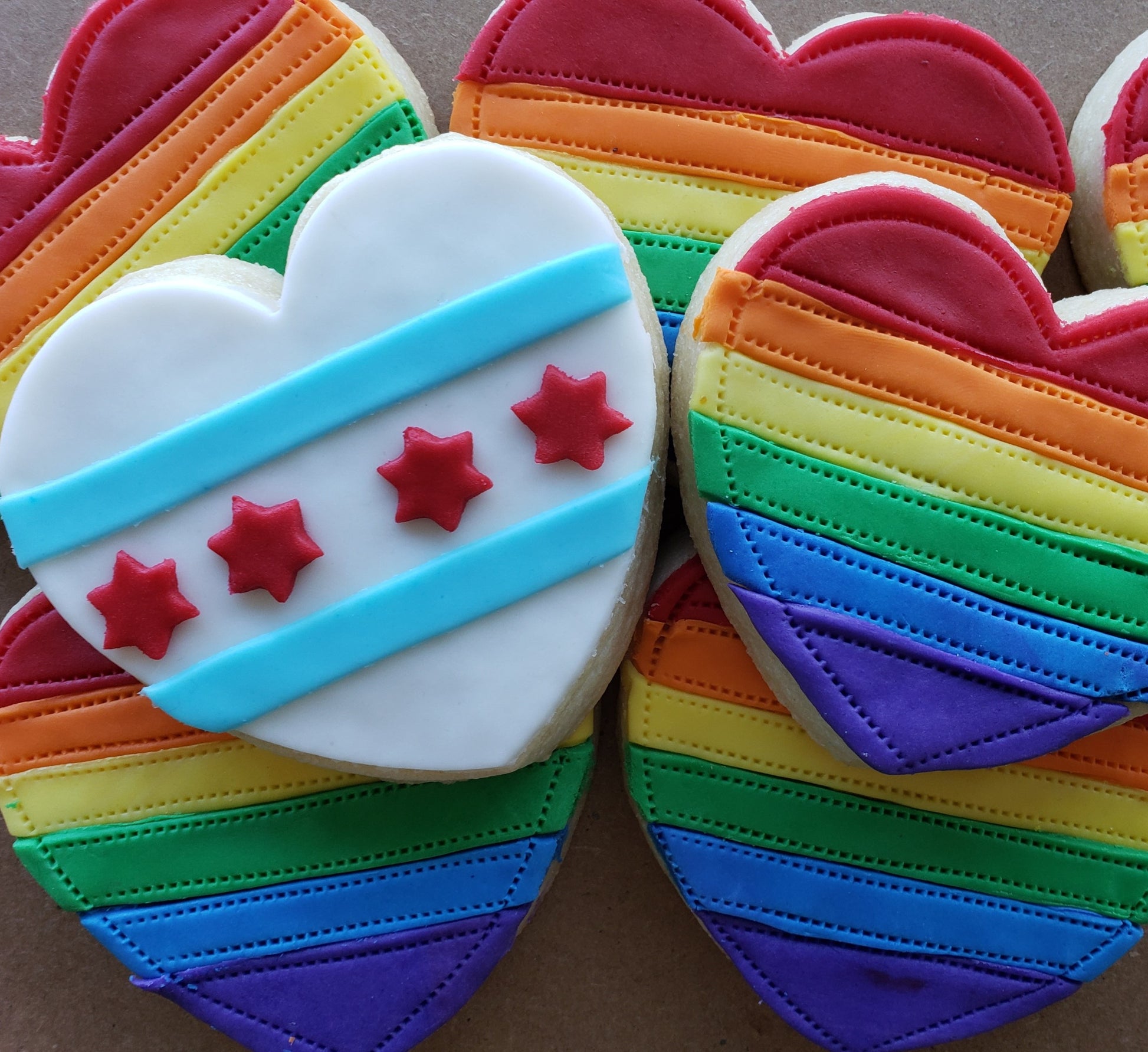 Our Chicago Flag cookies and stitched rainbow hearts made their first appearance during Chicago Pride Month, but have found there way into the hearts of Chicagoans at Valentine's Day, weddings, and of course Pride Parade day parties.