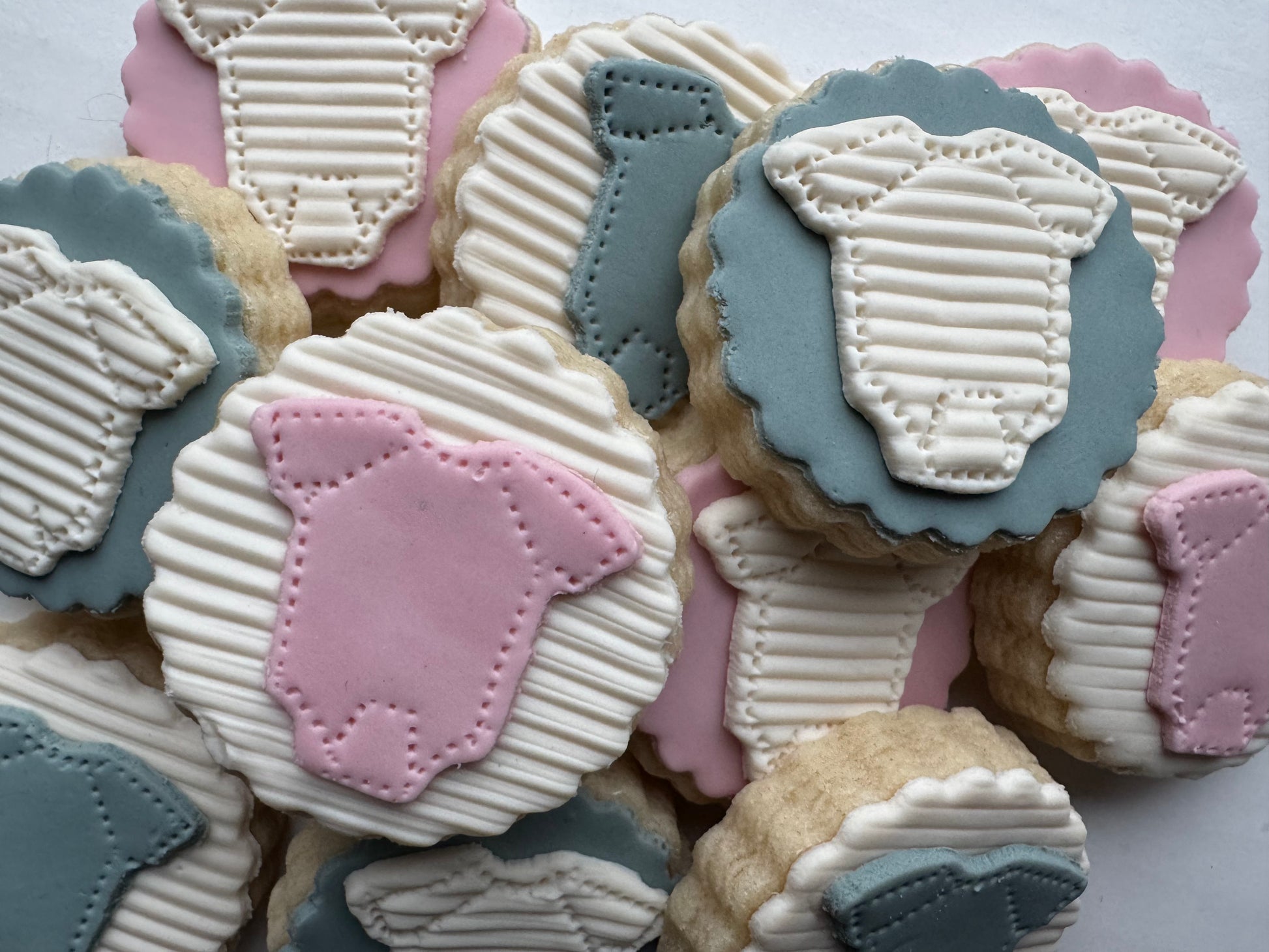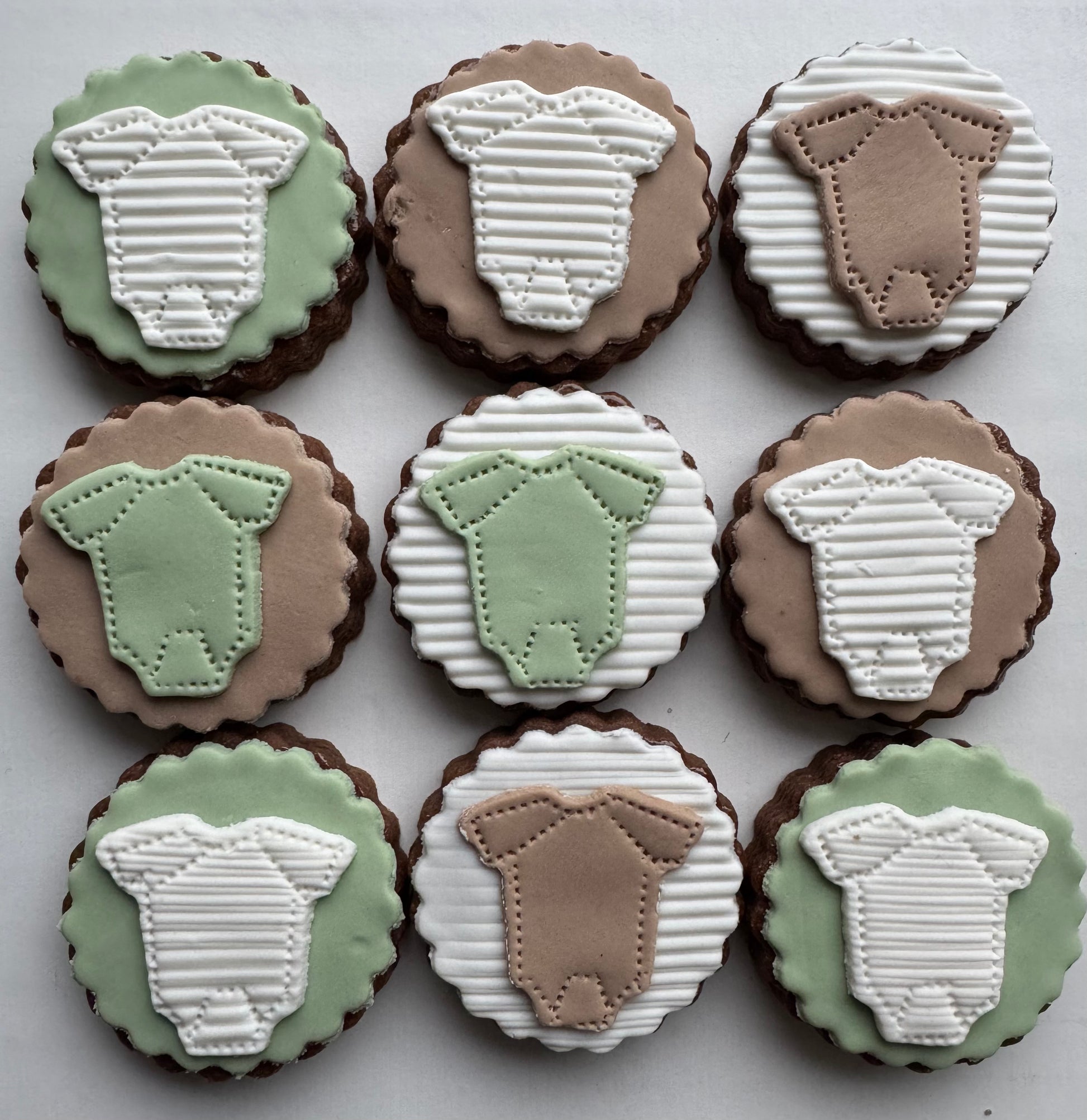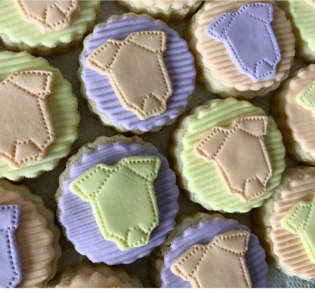 Same popular onesie tea coookies, same details, Onesie Tea Cookies are our most popular bbut in your custom colors - shown here in multicolored pastel orange, lavender and yellow combo, dusty rose and slate blue, sage & milk chocolate. Contact us by email to inquire about custom-design onesie cookies including metallics, custom colors, etc.
